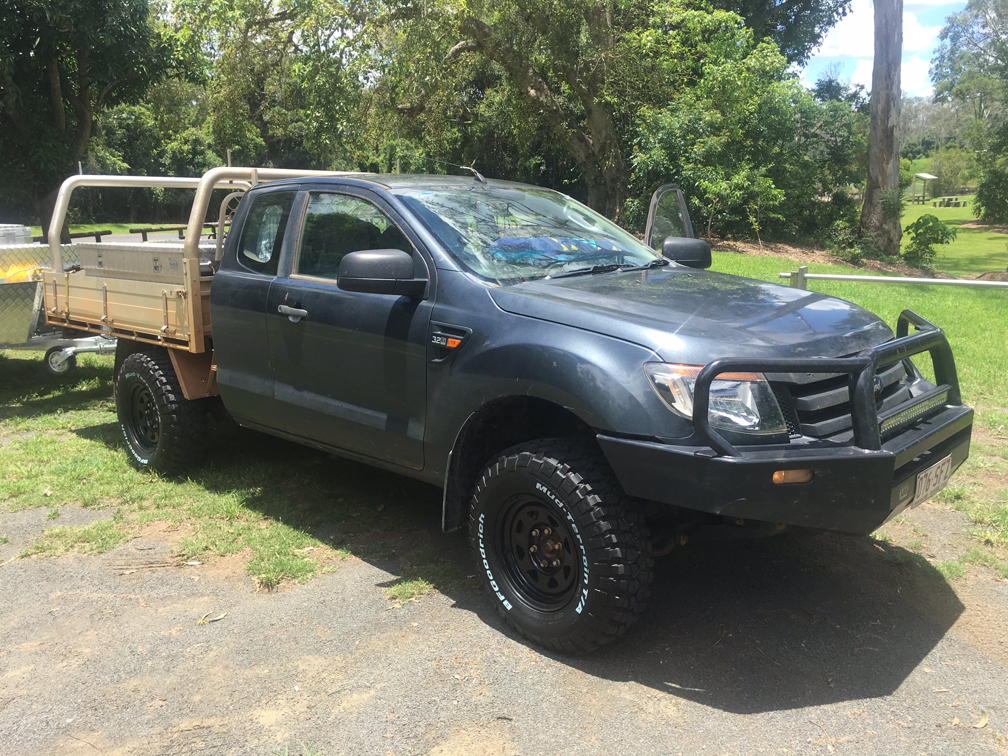 I made sure to get the exact same size tyres that are on my camper trailer. Although the tyres are on the camper are not mud tyres, they do have the same stud pattern. So now I carry 3 spares that are all interchangeable (two on the camper and one on the car).